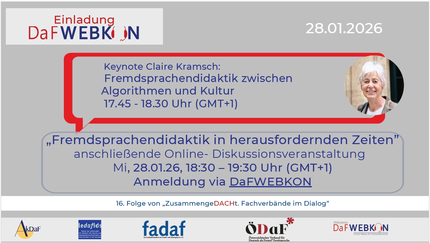 Die 16. Folge der Online-Veranstaltung ZusammengeDACHt findet am Mittwoch, den 28. Januar 2026, um 17:45 statt. ZusammengeDACHt ist eine gemeinsame Initiative der DaF/DaZ-Fachverbände der deutschsprachigen Länder (FaDaF aus Deutschland, ÖDaF aus Österreich und die Schweizer Verbände AkDaF und Lefadids).